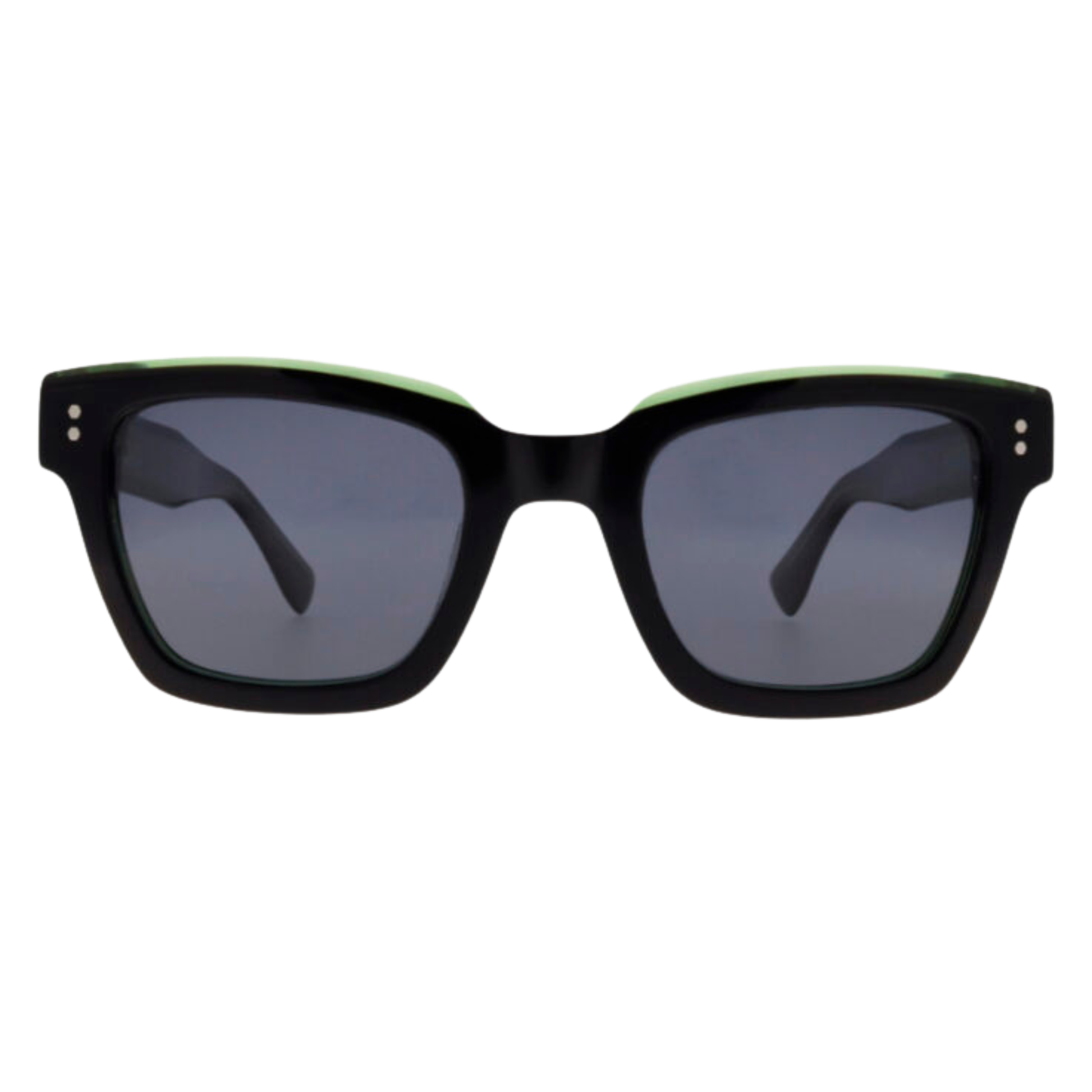Gafa de sol con lentes polarizadas en montura de acetato de alta calidad.. Fuerte y ligera, con detalles metálicos en talones y varillas. Diseño cuadrado alargado en color negro con detalles en verde que le dan luz y un toque divertido