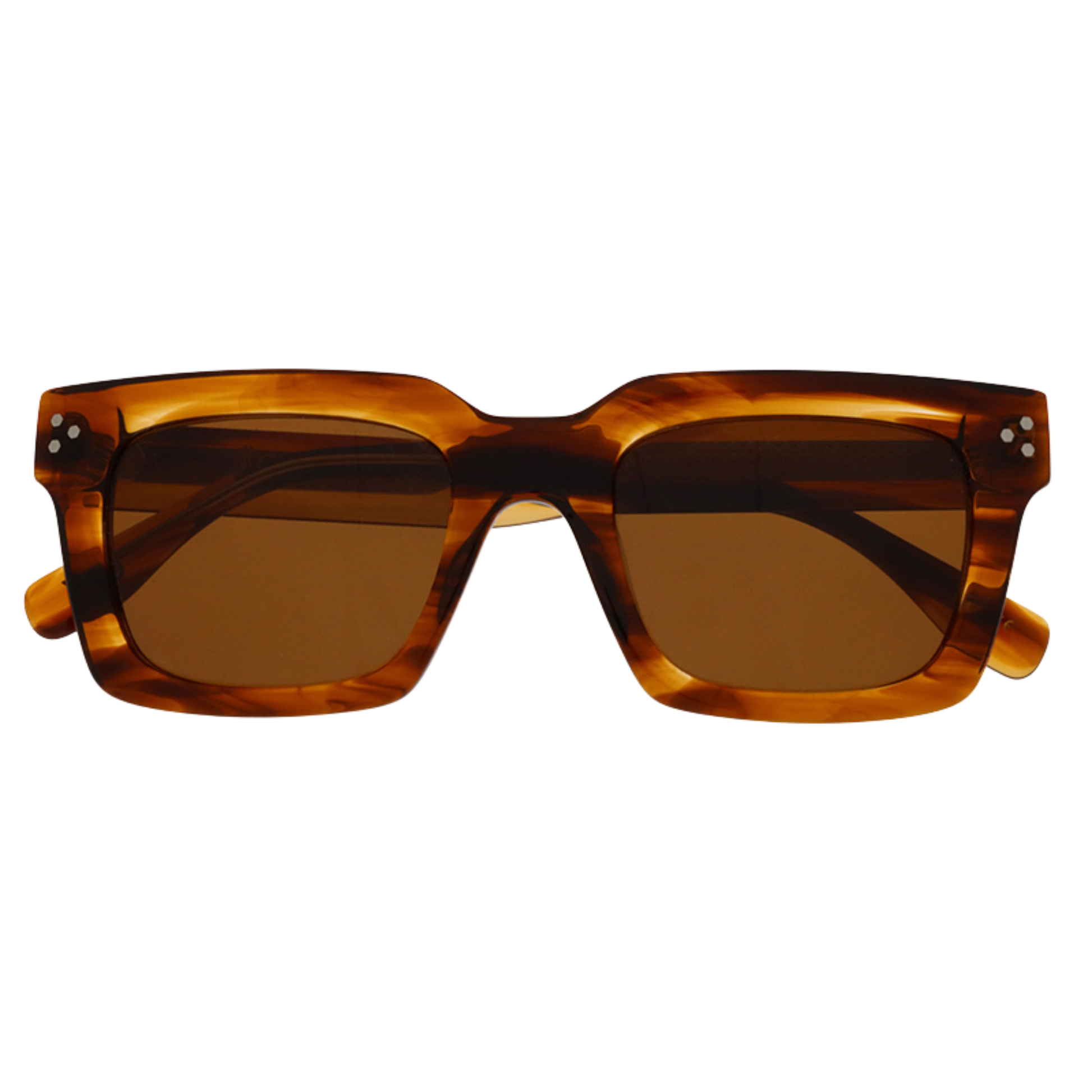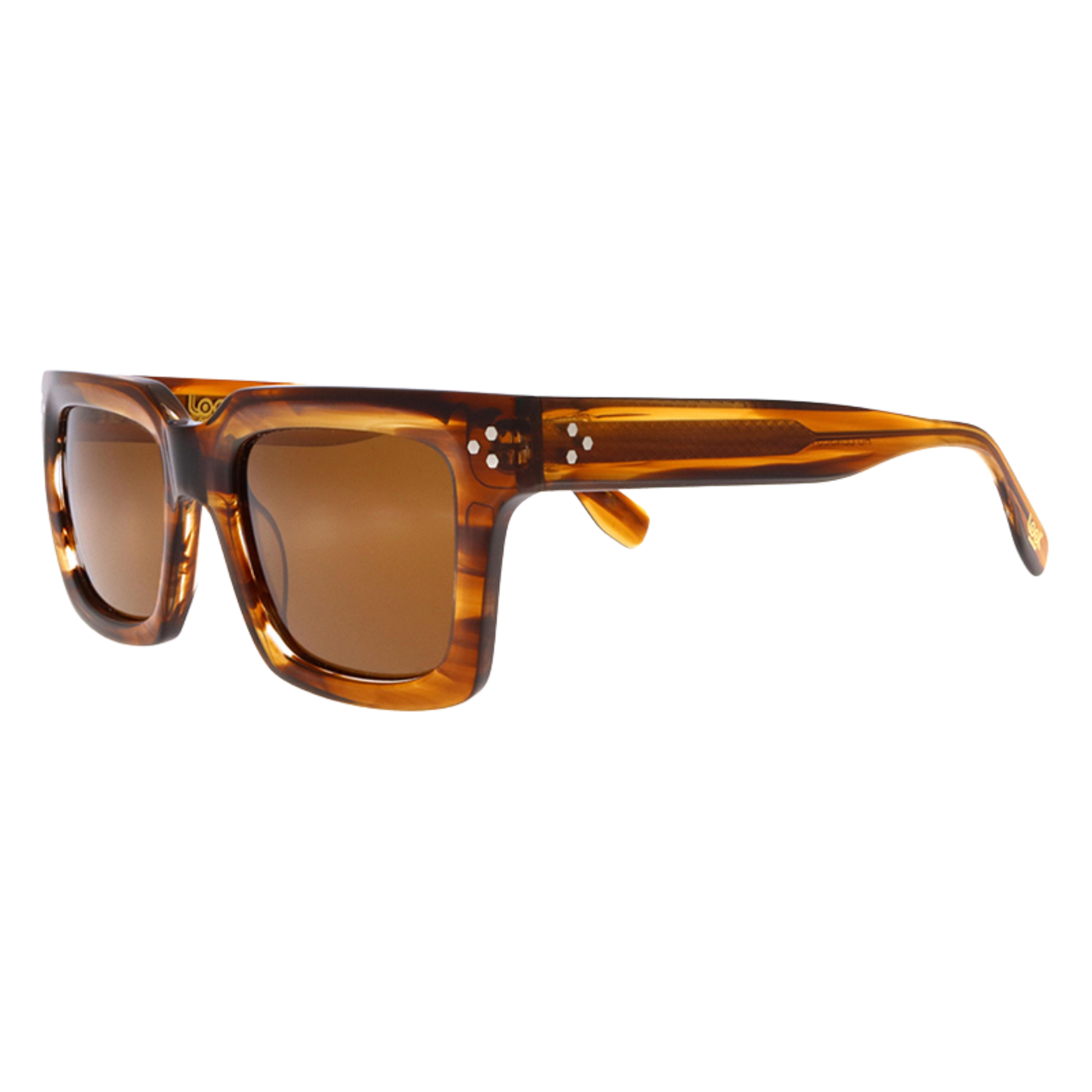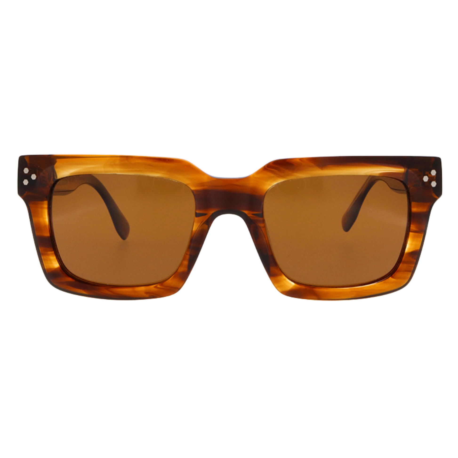 Gafas de sol de forma rectangular con lentes polarizadas. Fabricadas a mano en acetato de alta calidad para una estructura resistente y ligera. Con remaches metálicos en talones y varillas.