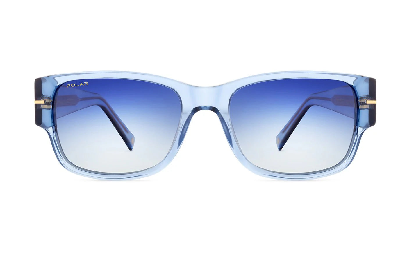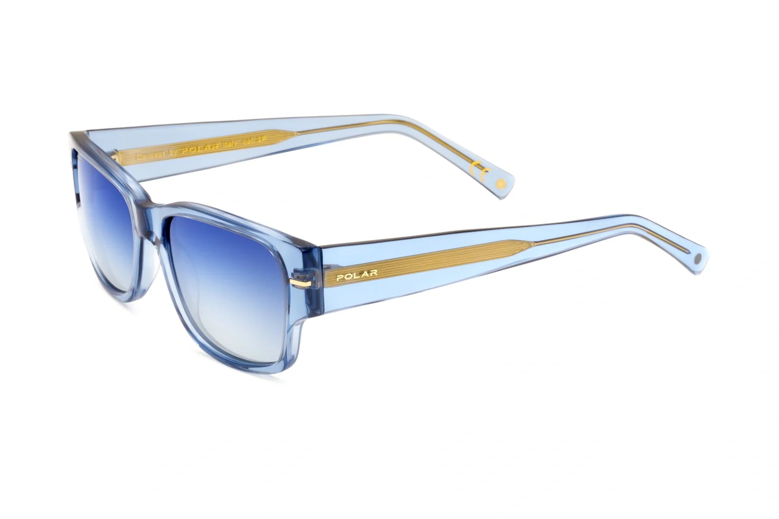 Gafa unisex de acetato azul traslúcido, varillas anchas con alma metálica en dorado que le da clase y elegancia. Lentes orgánicas polarizadas en azul degradado. Cómodas, ligeras y duraderas.